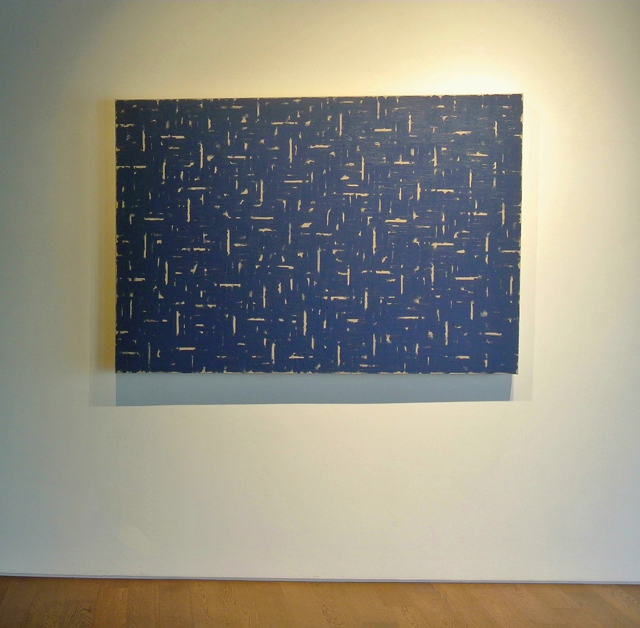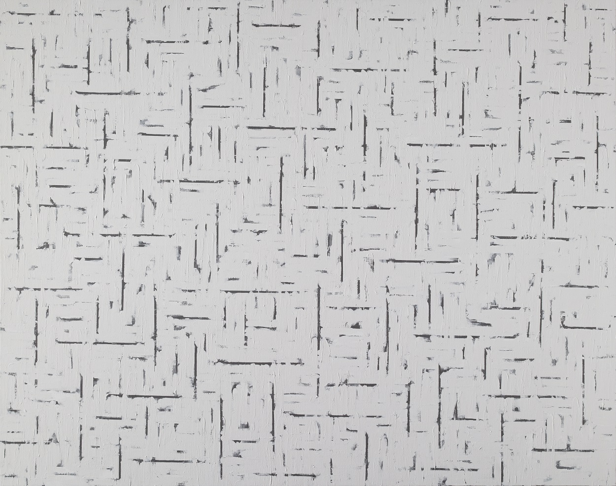 “캔버스바탕에 검은 질료로 전면도포하고 그 위에 백색(白色)으로 수직수평을 반복해서 쌓아가는 방식이다. 검은 바탕은 우주로 인식한 것이다. 그런 과정의 축적이 어느 단계가 되면 수직과 수평의 부침(浮沈)이 일어나고, 바탕은 선(線)이나 점(點)으로 남는 통어(統御)를 하는 것이다. 이 과정에서 나는 특히 추사체를 생각했다. 추사(秋史)가 새로운 공간을 정하면서 획을 펼치는 형식을 떠 올리기도 한다.2)”